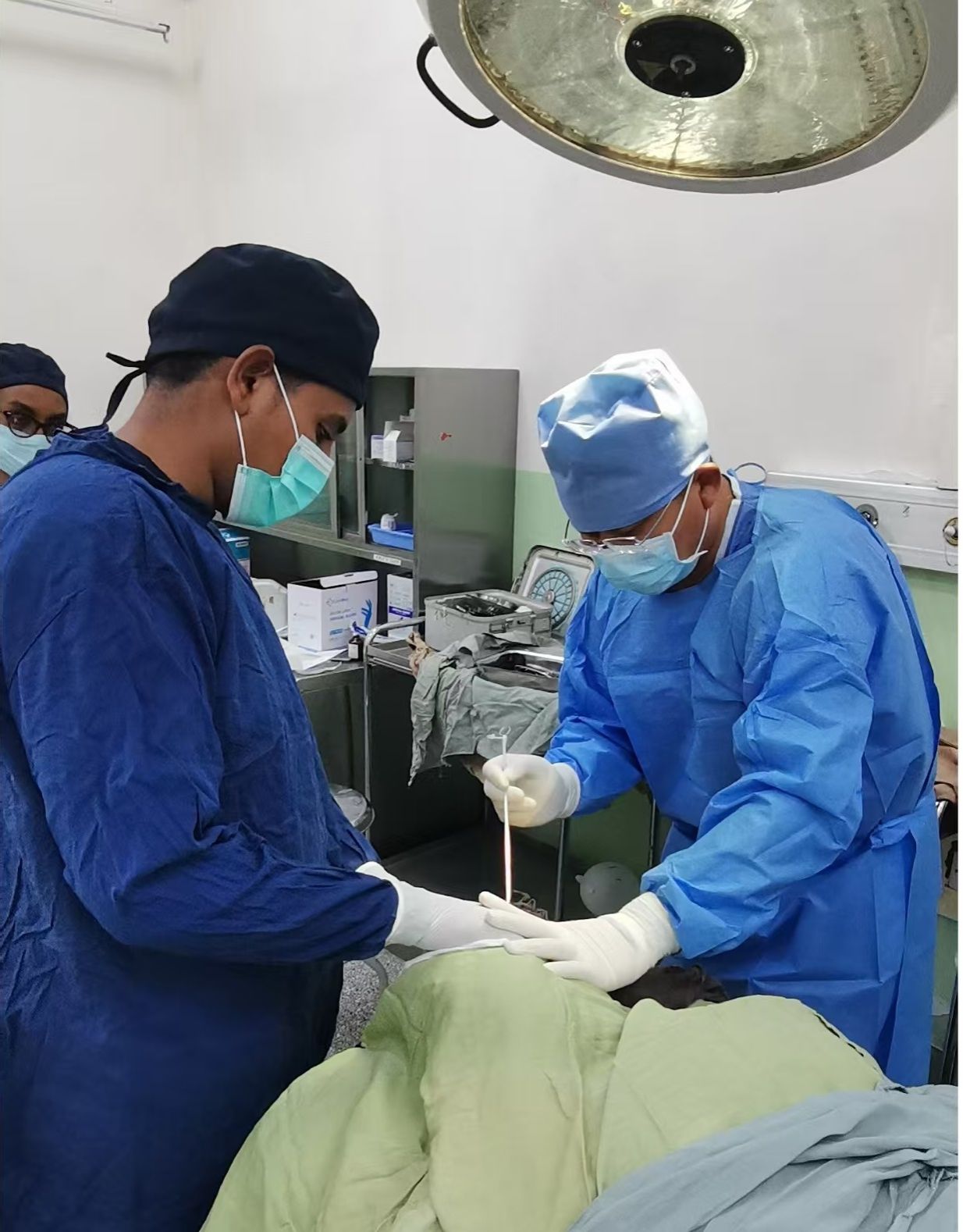 手术筹备时,当地捉襟见肘的医疗条件给两位医生出了难题。“手术室里的电动颅钻早已损坏无法使用,手术显微镜更是无从谈起,连最基础的开颅操作都只能靠手摇钻、线锯等简易器械完成。”李建东回忆,颅内手术对精确度要求极高,没有显微镜辅助,全靠肉眼观察,临床经验常规操作,相当于“在刀尖上跳舞”,不仅考验技术,更挑战体力与耐力。