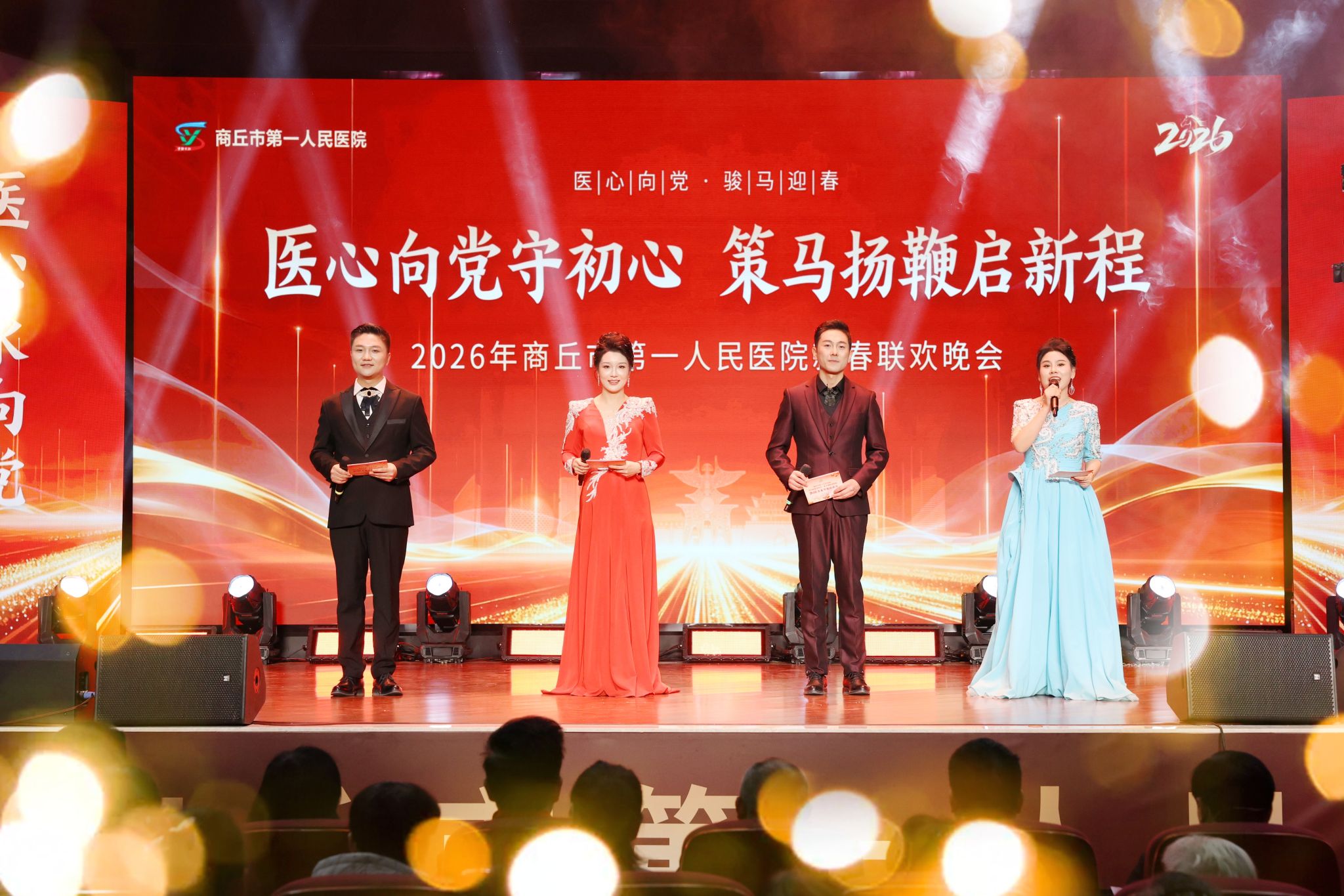 金鼓齐鸣辞旧岁,欢歌笑语迎新春。2月6日18时30分,我院门诊楼五楼大礼堂灯火璀璨、暖意融融,隆重举行以“医心向党守初心 策马扬鞭启新程”为主题的2026年春节联欢晚会。党委书记、院长王玉栋出席并致辞,院领导刘世界、许春进、赵梅、陈坤峰、王博、临床一线职工、离退休老同志代表及患者家属代表等500余人欢聚一堂,共贺新春、共话发展、共谱新篇。