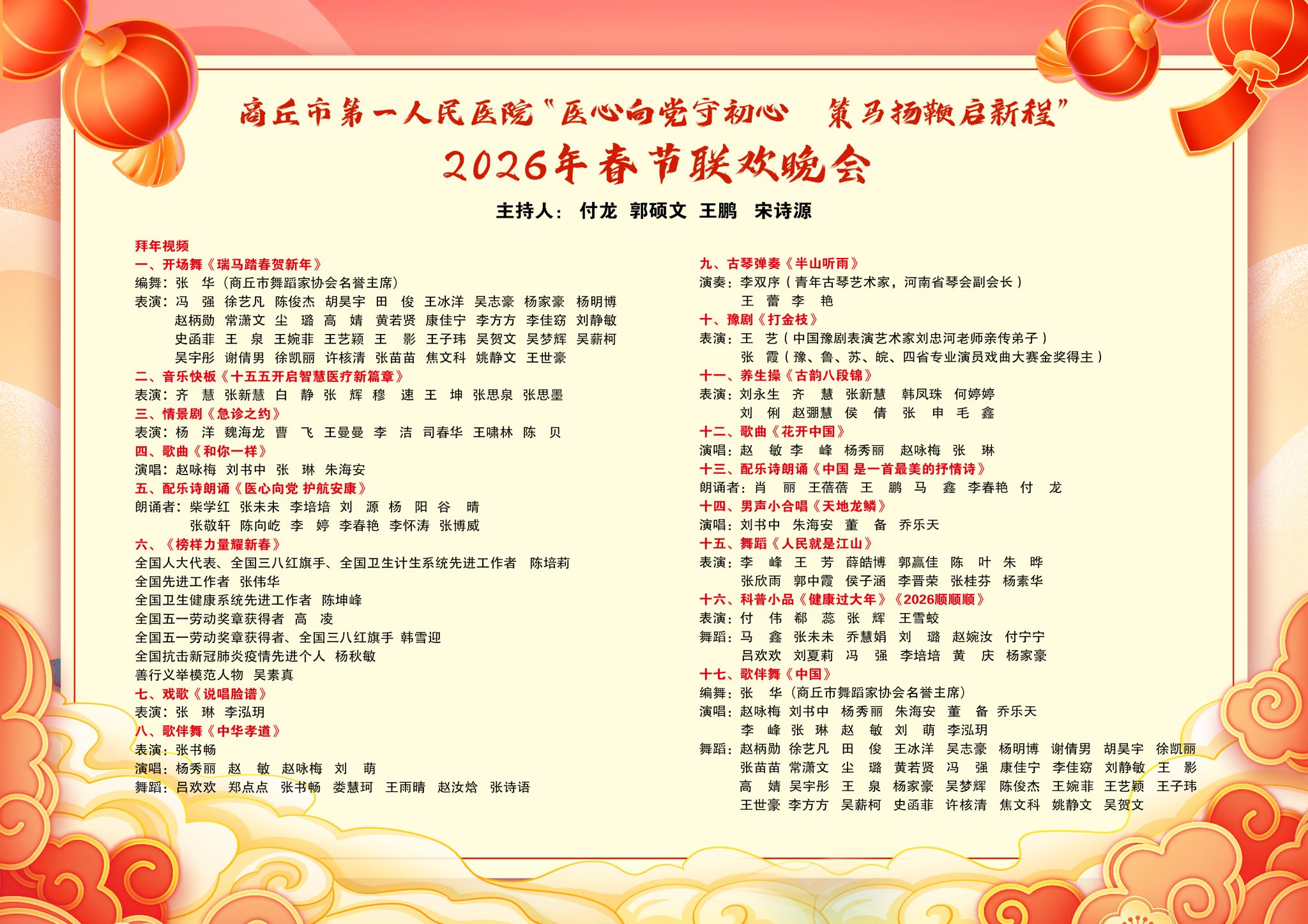 晚会上,120余名职工自编自演、轮番登台,节目形式多样、内涵丰富。音乐快板《十五五开启智慧医疗新篇章》、情景剧《急诊之约》、配乐诗朗诵《医心向党护航安康》、歌伴舞《中华孝道》《人民就是江山》、养生操《古韵八段锦》、科普小品《健康过大年》《2026顺顺顺》等作品,紧扣时代主题、彰显医者担当,兼具思想性与观赏性。晚会特邀中国豫剧表演艺术家刘忠河亲传弟子魏先、豫鲁苏皖戏曲大赛金奖得主张霞献演豫剧《打金枝》,青年古琴艺术家、河南省琴会副会长李双序演奏《半山听雨》,传统艺术与现代文艺交相辉映,现场掌声不断、气氛热烈。
