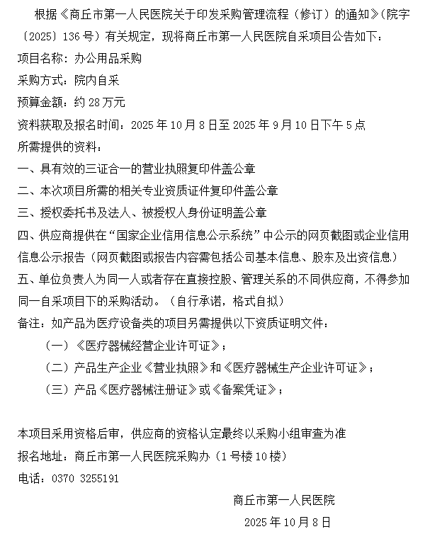 商丘市第一人民医院自采公告(2025-70)