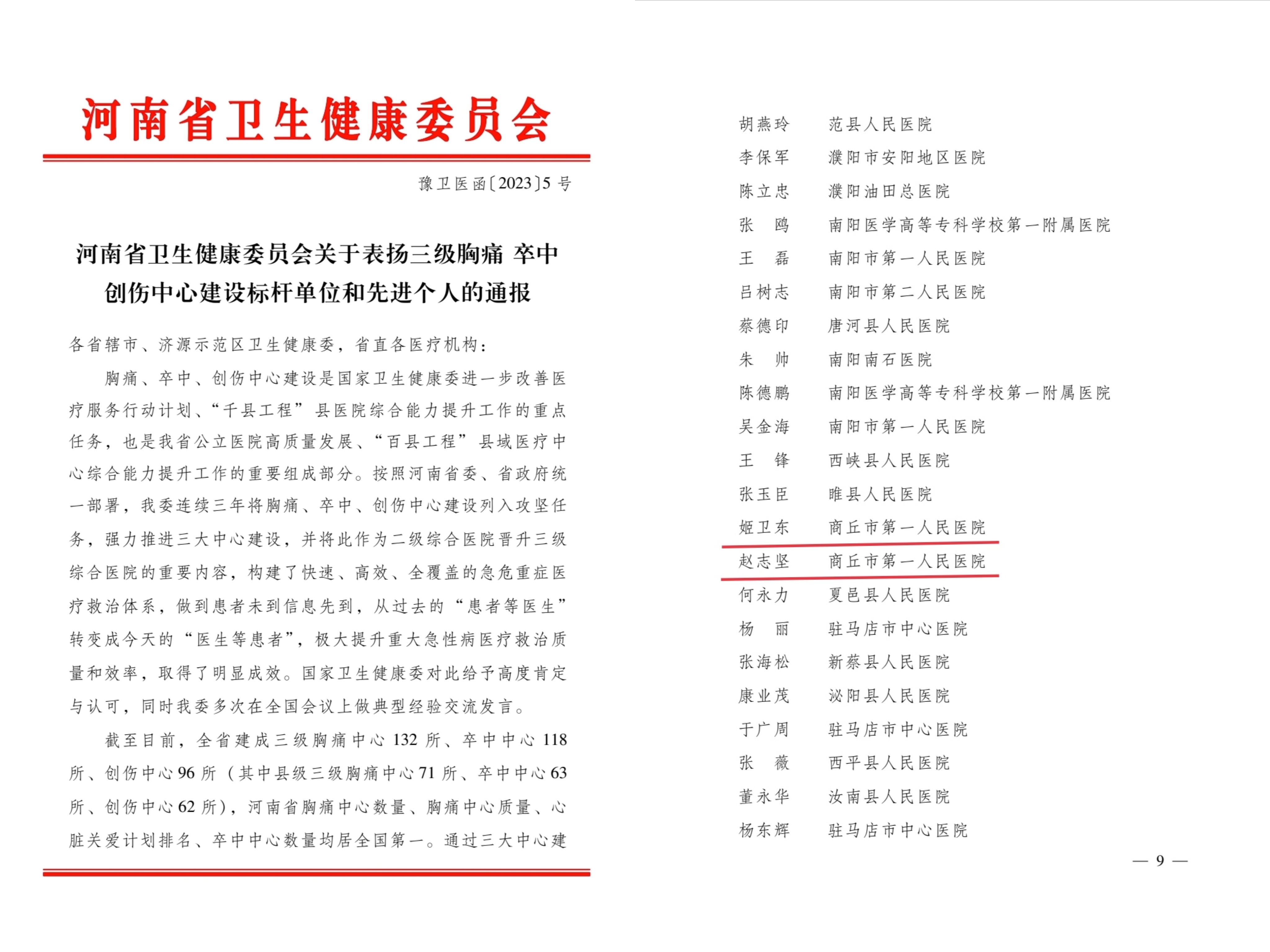 1月13日,河南省卫生健康委印发《关于表扬三级胸痛、卒中、创伤中心建设标杆单位和先进个人的通报》。我院医务部副主任姬卫东、急诊外科主任赵志坚荣获三级胸痛、卒中、创伤中心建设鸿雁奖,受到了通报表彰。