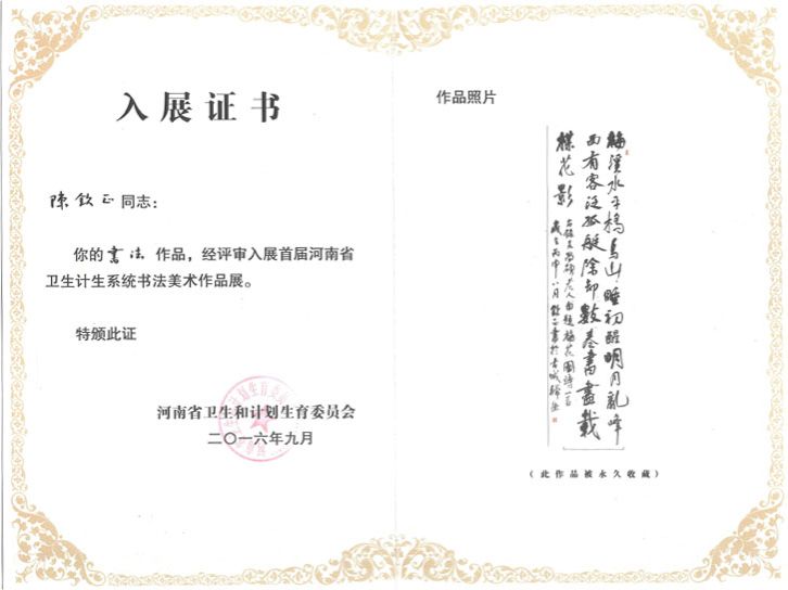 日前,河南省卫生计生委印发《关于表彰首届河南省卫生计生系统书法美术作品展获奖入展作者的通报》(豫卫办〔2016〕60号),我院职工陈钦正、郭来喜二同志参展的书法作品获奖,受到通报表扬。