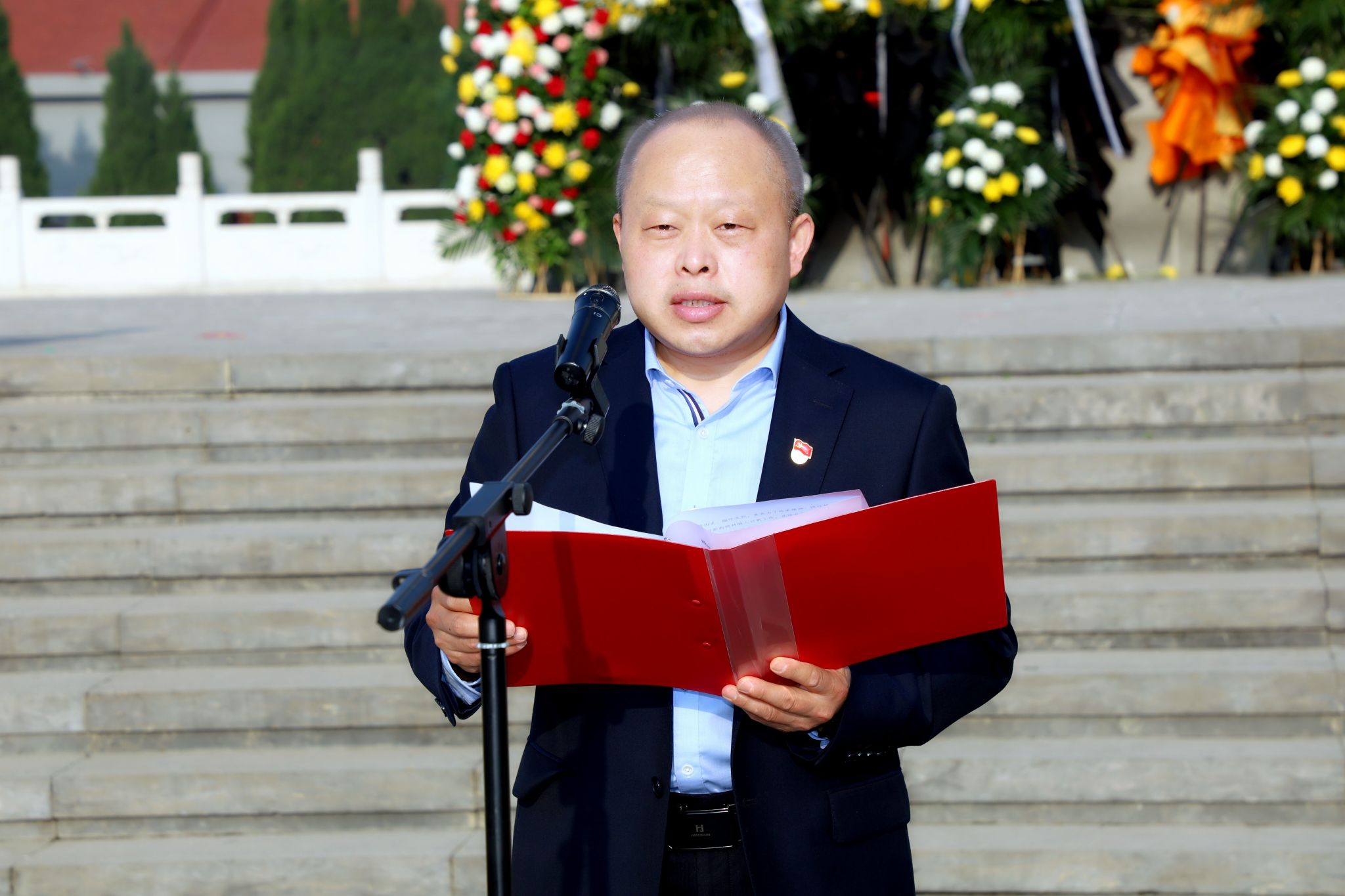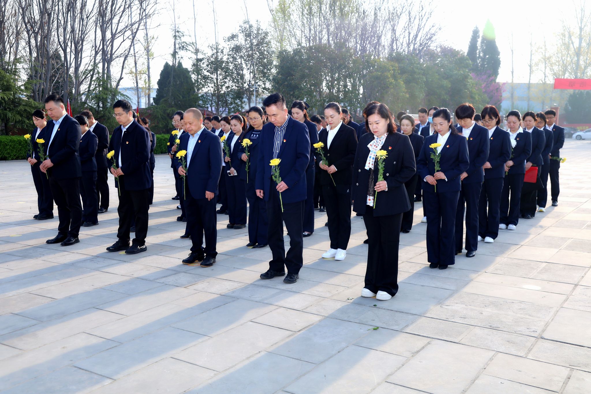 烈士陵园内松柏苍翠,氛围庄严肃穆。全体人员身着素装、手持白菊,整齐列队于烈士纪念碑前,全场肃立默哀三分钟,深切缅怀革命先烈的英勇功绩,感悟和平生活的来之不易。默哀毕,职工代表缓步上前,向烈士纪念碑敬献花篮并整理缎带,表达崇高敬意。