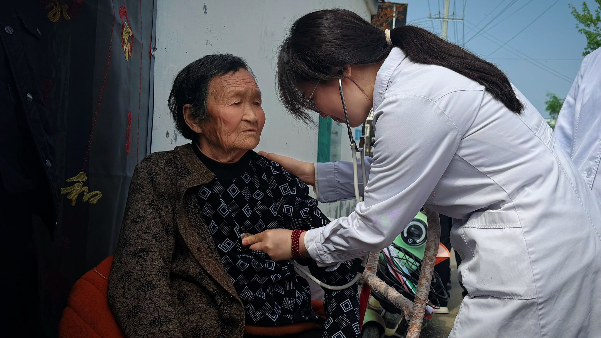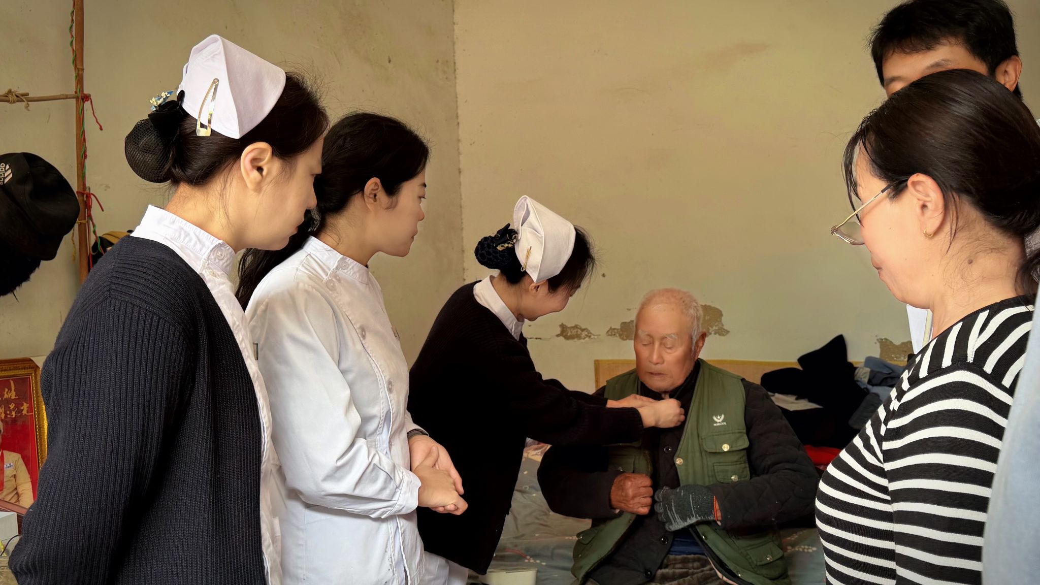 活动现场,专家团队为村民免费测量血压、血糖,开展心电图检查,细致问诊查体、分析病情,针对性提供诊疗、用药及健康养生指导,赢得村民一致好评。急救科普环节,冠心病起搏器科护理团队现场演示心肺复苏及AED操作流程,通过一对一教学、手把手指导,帮助村干部及村民熟练掌握急救技能,现场学习氛围热烈。党员联合服务队还深入高龄、行动不便村民家中,开展上门义诊、健康评估,同步提供农技种植指导与精神慰藉,把党组织的关怀送到群众身边。