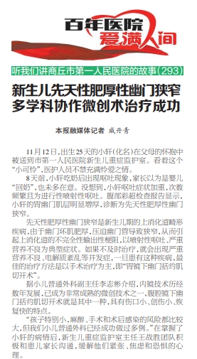 据了解,市第一人民医院小儿外科专业细化,分为小儿普通外科和小儿泌尿外科。他们在腹股沟疝、肠套叠、隐睾、包茎、泌尿生殖器畸形、先天性幽门肥厚狭窄、肛周脓肿、肛瘘、先天性胆总管囊肿、先天性直肠肛门闭锁等方面开展手术,效果很好。在微创治疗小儿疝、幽门肥厚狭窄、阑尾炎等方面有显著优势。目前,小儿普通外科腹腔镜手术占比80%以上。