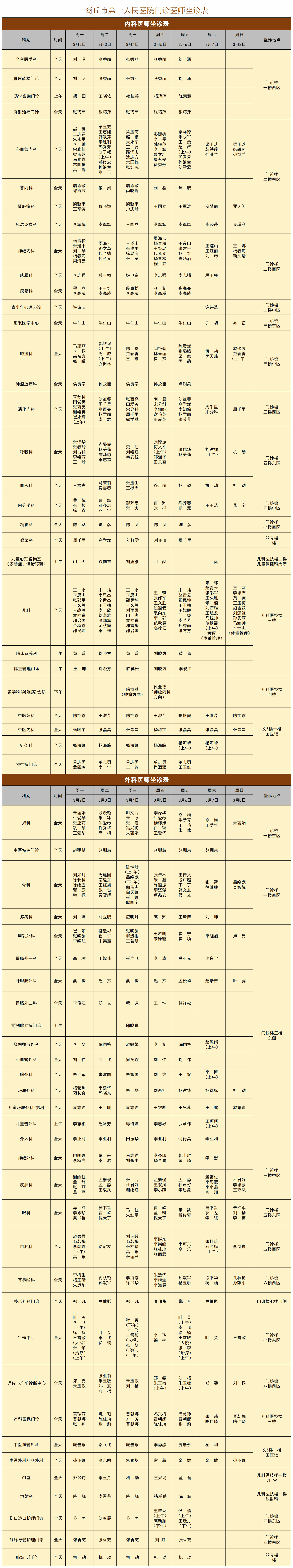 商丘市第一人民医院门诊排班表(3月2日—3月8日)