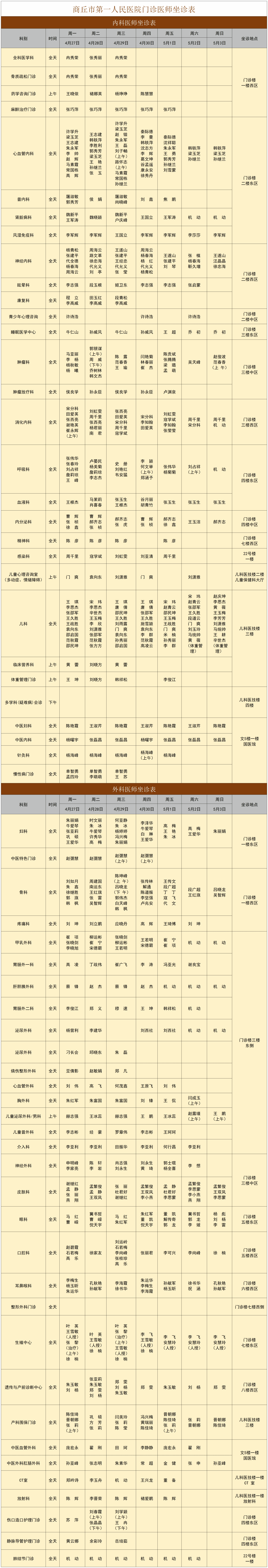 商丘市第一人民医院门诊排班表(4月27日—5月3日)